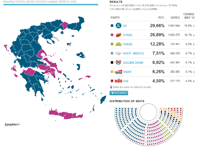 Sur le sujet des élections législatives, mais un peu plus loin en Europe, celle réalisée par Igraphics, site monté par des journalistes et des designers d’informations grecs, est très réussie. Sans extravagance, elle rassemble sur une seule page les différentes données du scrutin : cartographie des résultats, couleur de la nouvelle assemblée, pourcentage des votes, etc. Pas si fréquent.